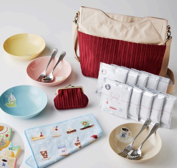 | 内容 | キルティング舟形バッグ(約27×11×23cm[底辺×マチ×高さ]) キルティングポーチ(約16×8×14cm[底辺×マチ×高さ]) 福袋オリジナルドリップコーヒー×6杯 コどら コーヒービーンズチョコ25g しっとりクッキー コーヒーチケット(1冊 ※店舗により綴り枚数が異なる) コメ宝くじ付き新春スナックチケット(3枚綴り) ※ホットドッグ/小倉トースト/ミニシロノワール |
