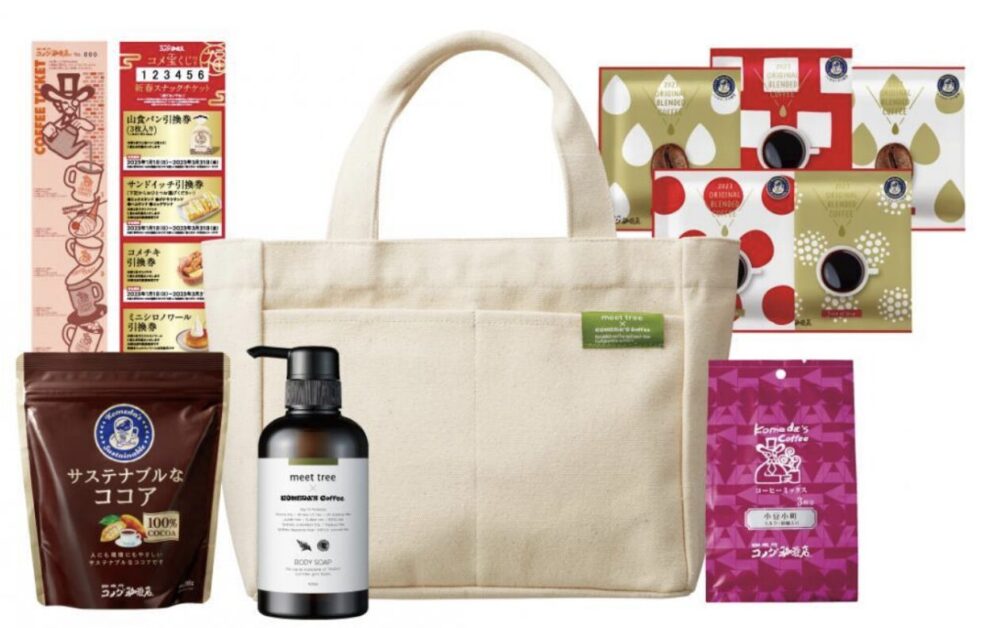 | 内容 | meet treeコラボトートバッグ(サイズは横約33cm×高さ19cm×マチ12cm) meet treeハンドクリーム(内容量30ml) オリジナルドリップコーヒー(バイオコークス焙煎/5杯分) コメ宝くじ付き新春スナックチケット3枚綴り 山食パン(3枚入り)/ミニシロノワール/手作りたまごドッグ 珈琲ばうむ コーヒービーンズチョコ プレミアムコーヒーSophia コーヒーチケット1冊 |