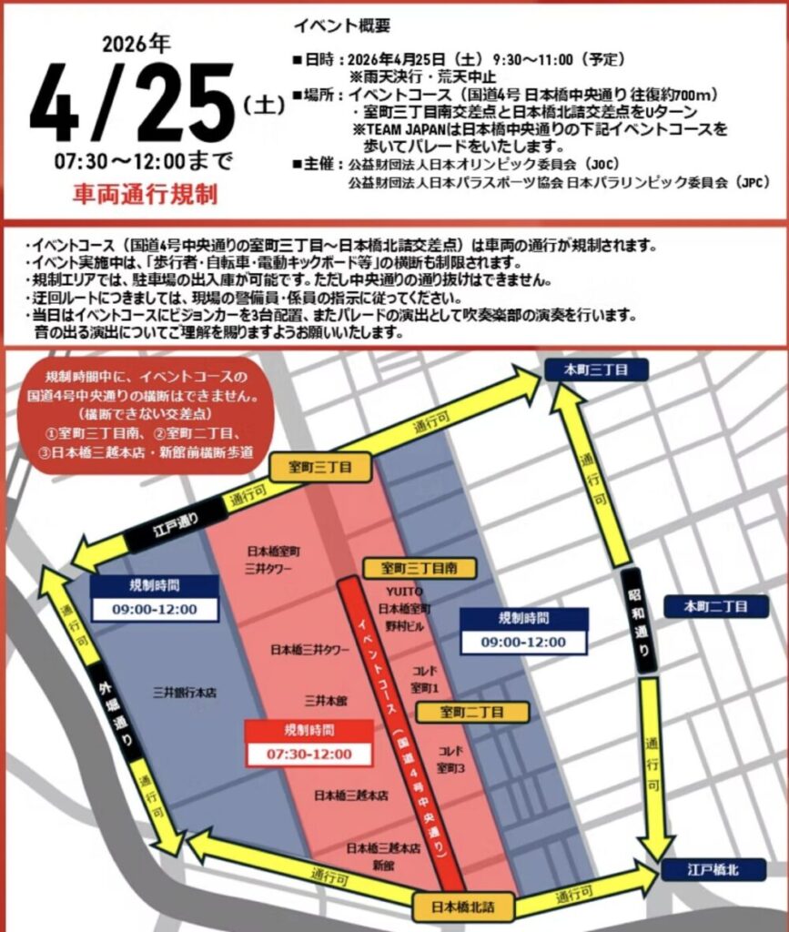 今回のTEAM JAPAN 応援感謝パレードは、東京都中央区の日本橋エリアにある日本橋中央通り(国道1号線)を舞台に、約700mの特設コースを往復する形で行われます。