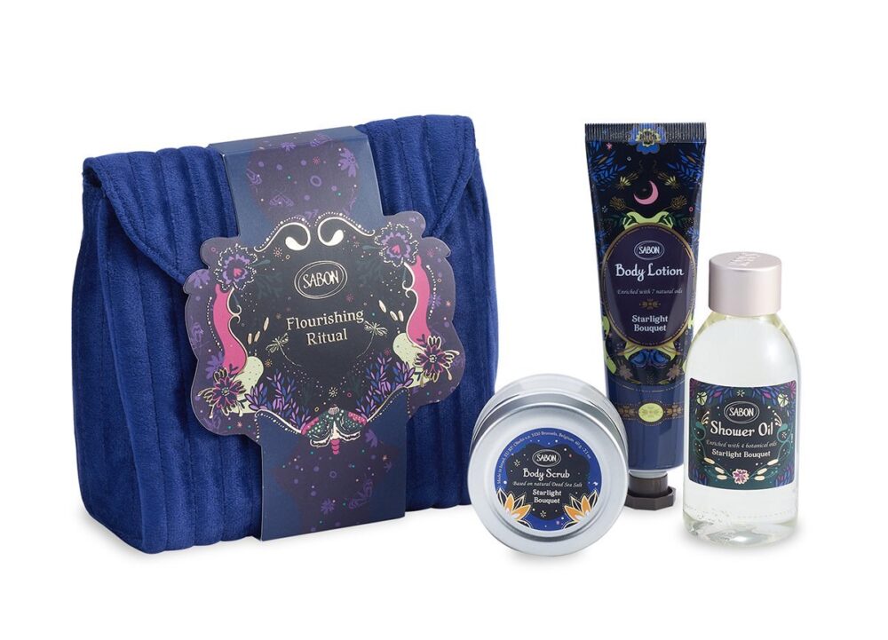 内容 | シャワーオイル スターライト・ブーケ 100ml ボディスクラブ スターライト・ブーケ 60g ボディローション スターライト・ブーケ 50ml ベルベットポーチ |
